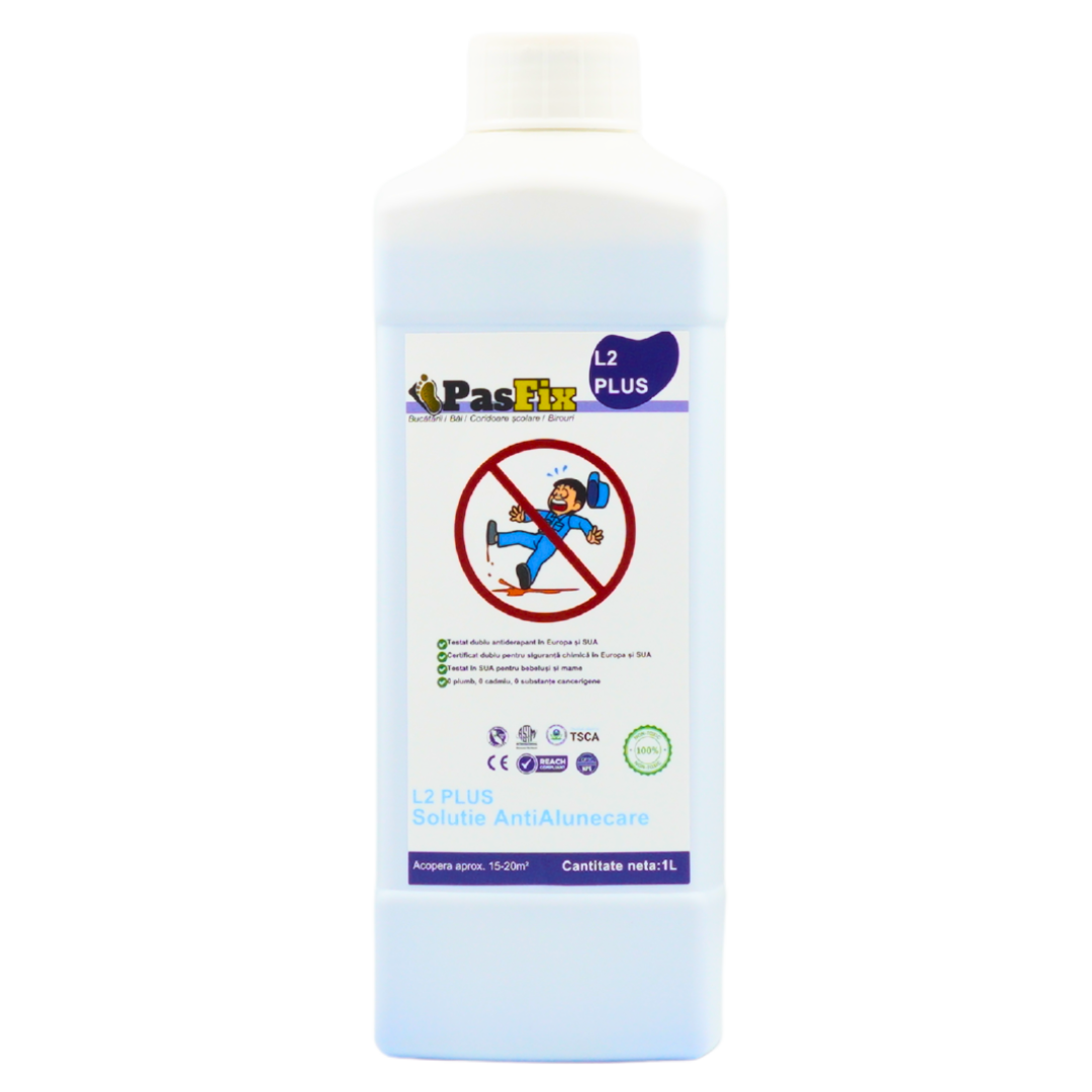 PasFix L2 PLUS 1L este o soluție antialunecare profesională, recomandată pentru băi, bucătării, birouri și coridoare școlare. Testată și certificată în Europa și SUA, soluția oferă protecție sigură și eficientă împotriva alunecărilor, fiind 100% non-toxică și prietenoasă cu familia și mediul.